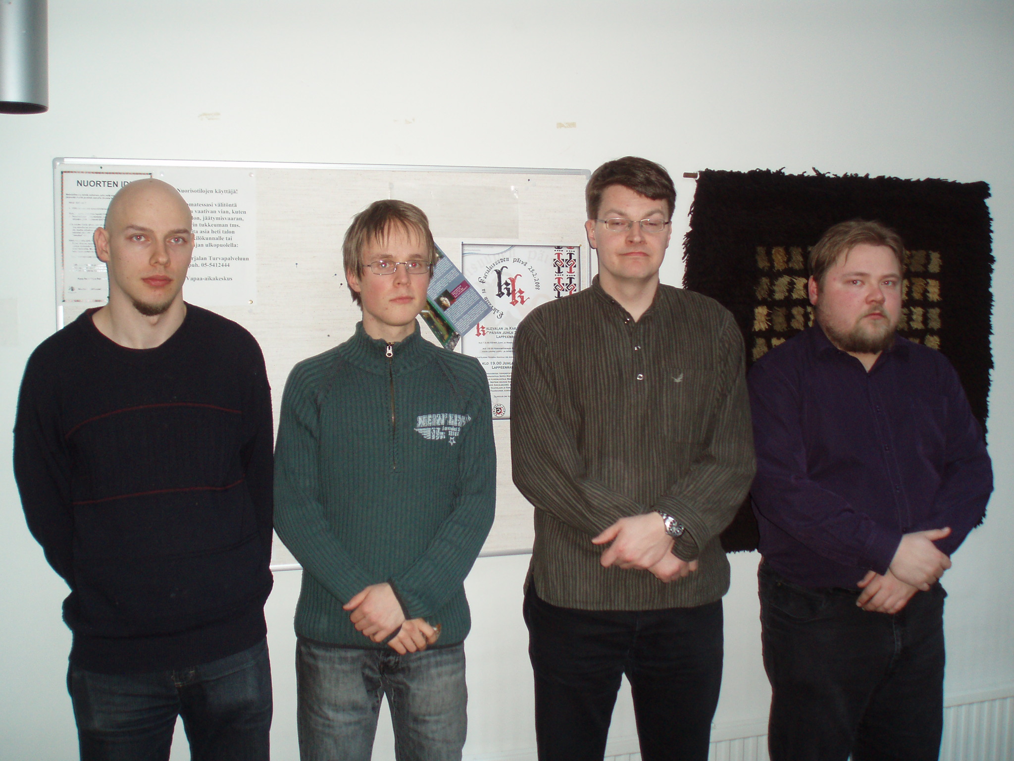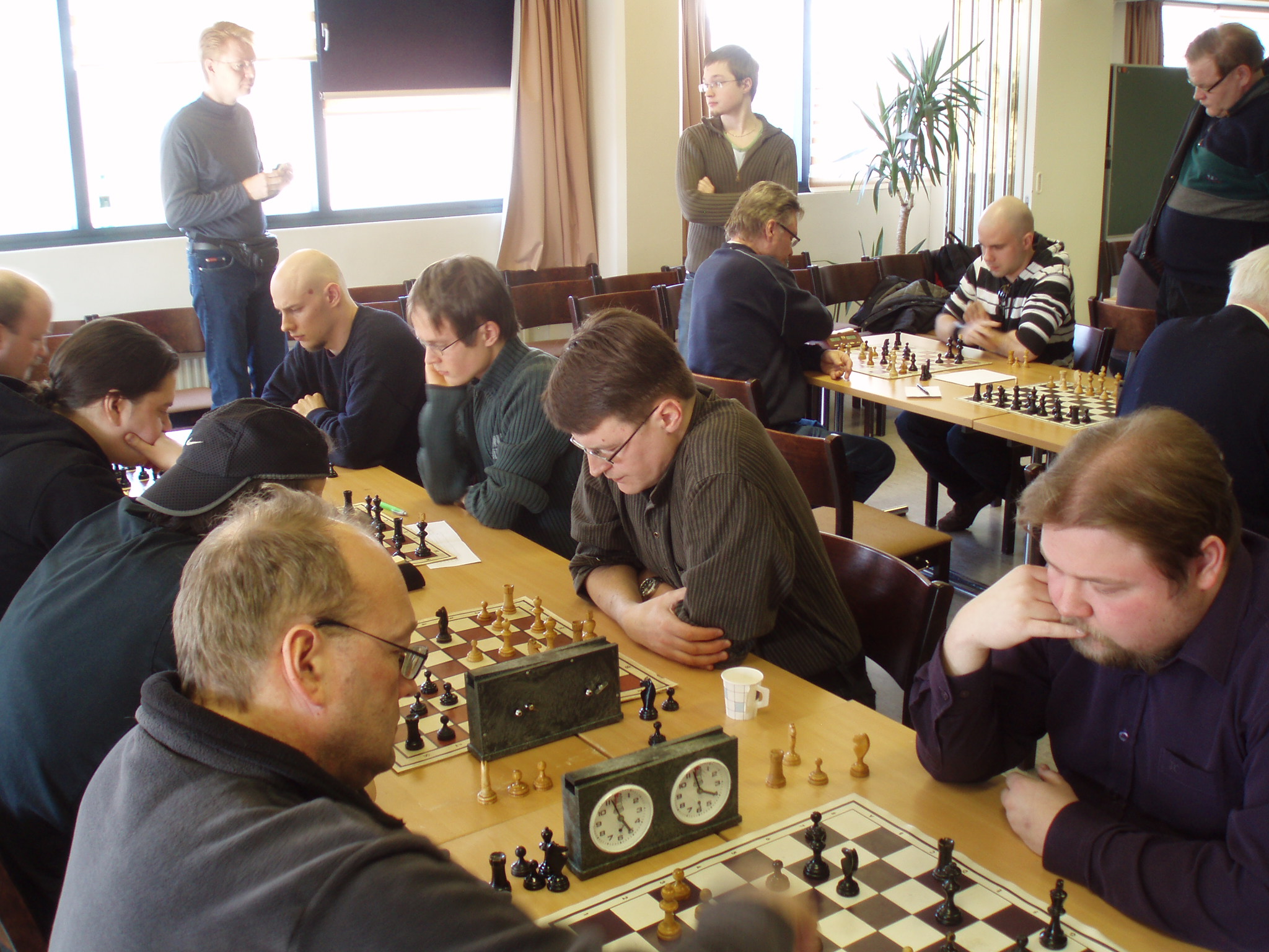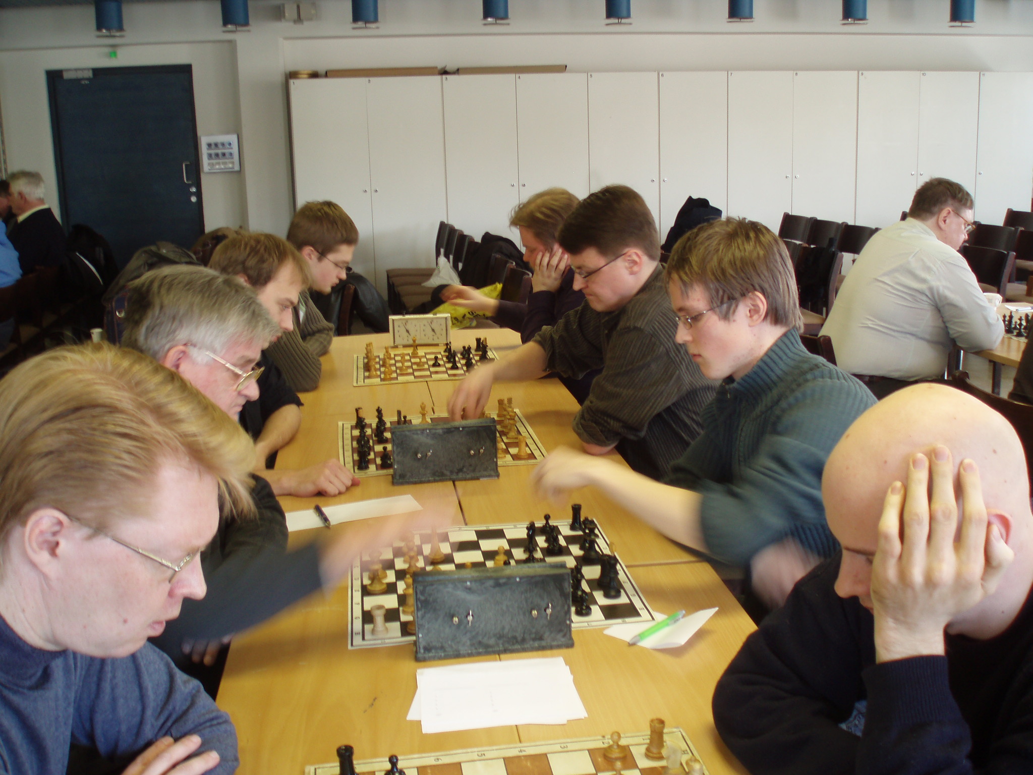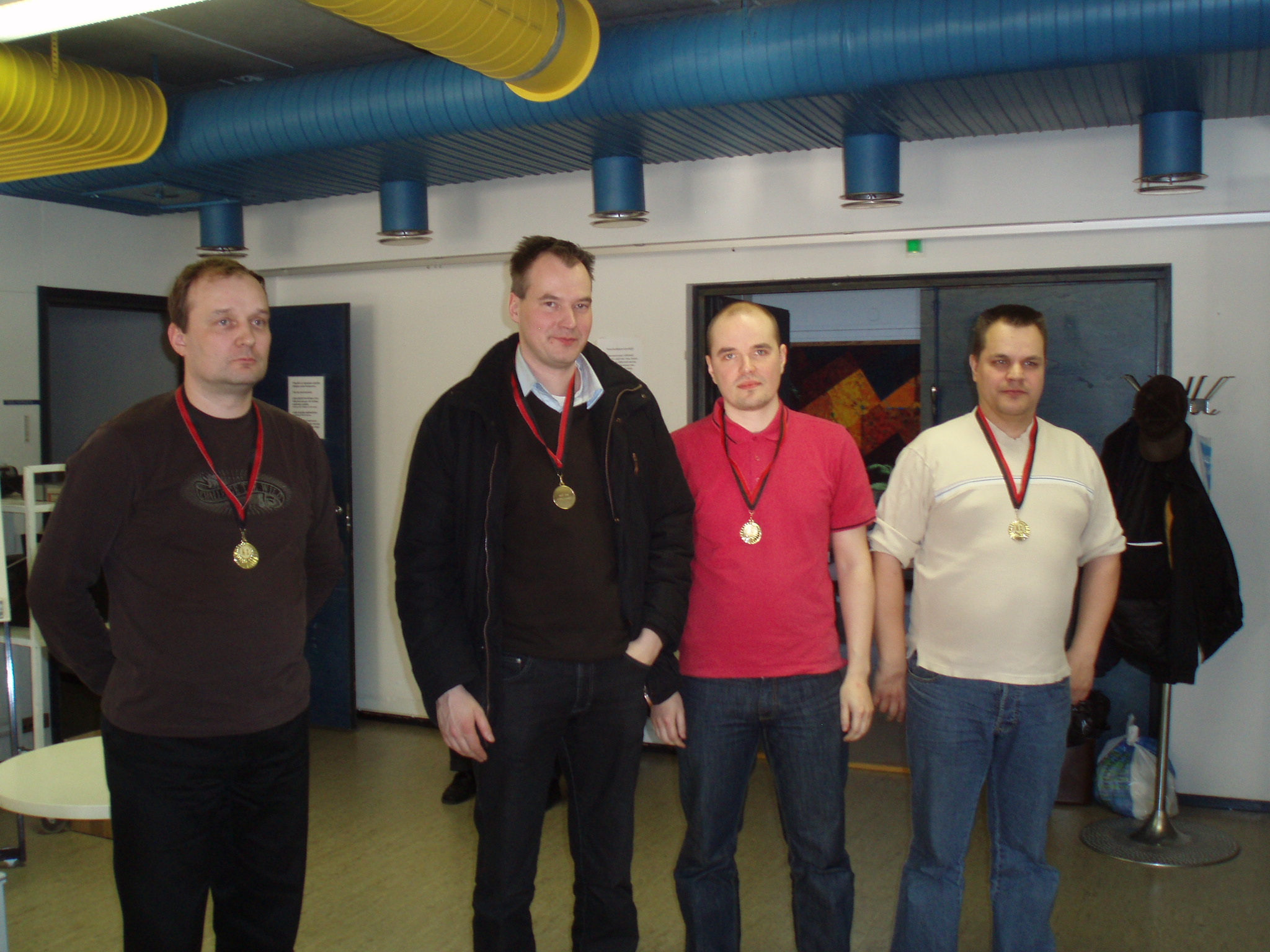 Pohjois-Kymelle Kaakkois-Suomen joukkuepikashakin mestaruus Kuusankoskelainen Pohjois-Kymen Shakki voitti toistamiseen joukkuepikashakin Kaakkois-Suomen shakkipiirin mestaruuden Lappeenrannassa 29.03.08 pelatussa turnauksessa. Mestarijoukkueessa pelasivat Jukka Puranen (16,0 pistettä), Jani Väkevä (13,5), Mauri Lehtosaari (14,5) ja Jukka Aho (12,5) Hopeaa saanut Lappeenrannan Shakkikerho jäi mestareista kaksi pistettä. Joukkueessa pelasivat Juha Kemppinen (13,0), Klaus Hirvonen (13,0), Tuomo Niemelä (15,5) ja Pekka Sopanen (13,0). Karhulan Työväen Shakkikerho sai pronssia joukkueella Jussi Upero (10,5), Timo Nippula (14,5), Mika Koskinen (11,0) ja Martti Mujunen (14,5). Pohjois-Kymelle se hävisi 6 pistettä. Viime vuoden hopeajoukkue Mikkelin Shakkikerho ei nyt yltänyt mitaleille. Se oli neljäs ja hävisi peräti 16,5 pistettä voittajalle. Pronssikin jäi 10,5 pisteen päähän. Joukkueessa pelasivat Petri Jäntti (11,0), Jussi Hämäläinen (9,0), Timo Aalto (10,5) ja Jussi Marttinen (9,5). Viimeksi mainittu oli varapelaaja ja pelasi hyvän tuloksen neljännellä pöydällä. Kilpailuun osallistui 7 joukkuetta ja se pelattiin kolmen kierroksen täyskierroskilpailuna. Tulokset: 1) Pohjois-Kymen Shakki 56,5 (72,0) 2) Lappeenrannan SK 54,5 3) Karhulan TS 50,5 4) Mikkelin SK 40,0 5) Shakkiympyrät, Hamina 21,5 6) Lappeenrannan SK II 18,0 7) Lahden Shakki 11,0 Pöytien parhaat: 1.pöytä: Jukka Puranen (PoKS) 16,0 (18,0) 2.pöytä: Timo Nippula (KarhTS) 14,5 3.pöytä: Tuomo Niemelä (LprSK) 15,5 4.pöytä: Martti Mujunen (KarhTS) 14,5 Ohessa kuvia:![]()