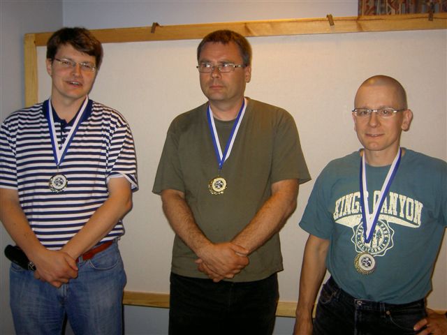 Risto Nokka (keskellä) voitti murskaavan ylivoimaisesti yhdeksännen mestaruutensa pikashakissa. Hopeaa sai Timo Aalto (vas) ja pronssia Jari Ihonen
